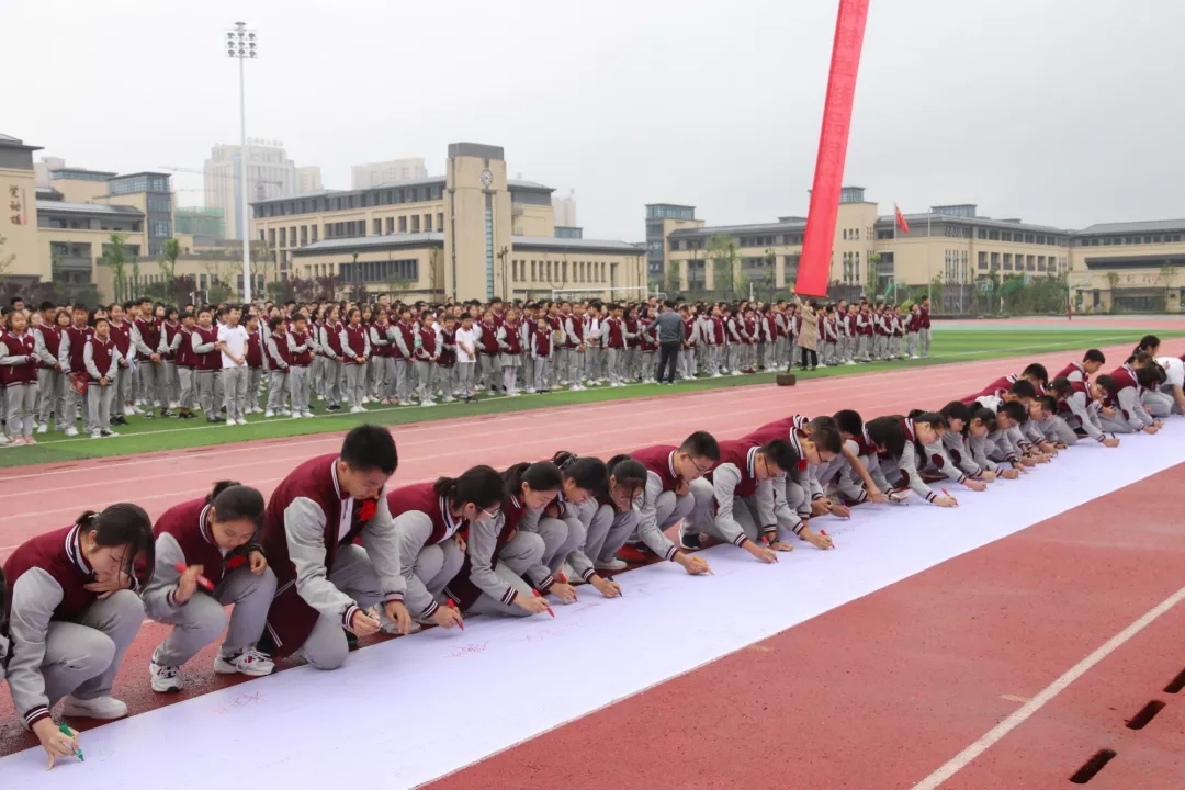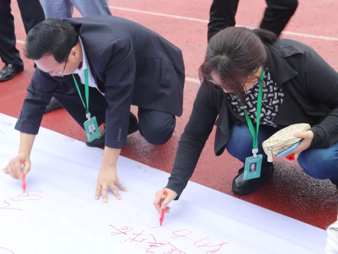 之后,師生們來(lái)到了百米長(zhǎng)卷面前,用筆墨書(shū)寫(xiě)了心聲和誓言。大家不忘初心,牢記使命。主席臺(tái)上,高一年級(jí)的張?jiān)婄鳌⒃撩?、孔令羽和鄭暢同學(xué)為我們帶來(lái)了歌曲演唱《最初的夢(mèng)想》。歌聲飄蕩在衡川運(yùn)動(dòng)場(chǎng)的上空,最初的夢(mèng)想永遠(yuǎn)在我們心中。