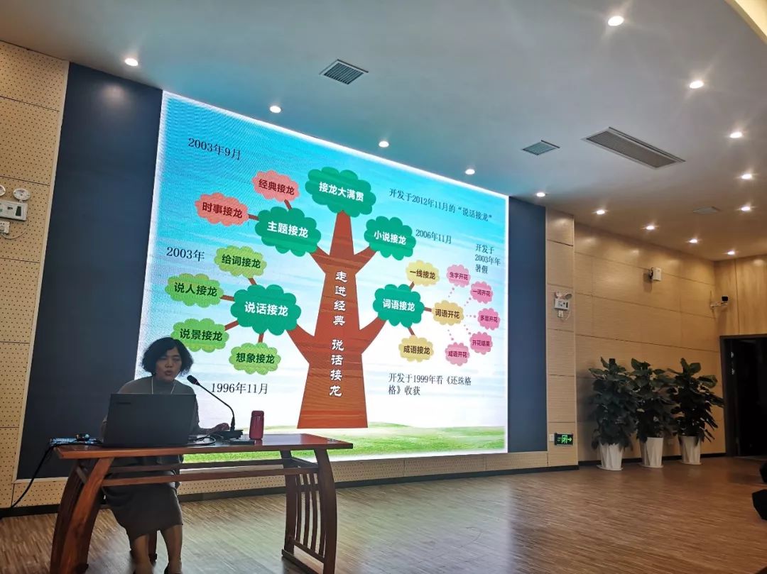 課堂結束后,丁老師又在階梯教室進行了《說話接龍之積累、激活、應用》的講座,和老師們分享了“生字開花  ”“說話接龍”教學的意義和具體實施方法。