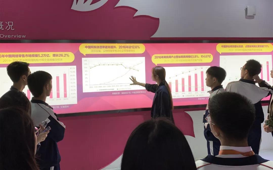 同學(xué)們先到達唯品大學(xué)。在這里,同學(xué)們簡直大開眼界,不僅了解了唯品會的發(fā)展歷程和組織文化,以及核心特賣聚焦品類、客戶群體、相關(guān)歷史網(wǎng)購數(shù)據(jù)、全國每日實時在線客戶人數(shù)、全國每日實時訂單數(shù)量等,還有物流倉儲系統(tǒng)、3D虛擬試衣、公益文化。