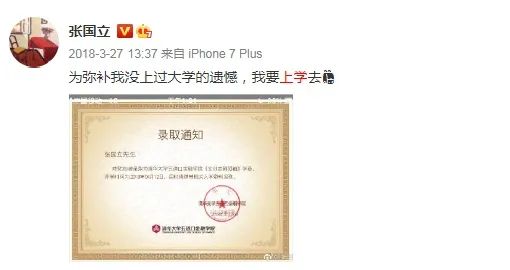 前年,64歲的演員張國立憑借自己的努力,自學(xué)考生,成功考上清華大學(xué)五道口金融學(xué)院,在收到錄取通知書后,第一時間在微博上分享了自己的喜悅,并配文“為彌補我沒上過大學(xué)的遺憾,我要上學(xué)去”。